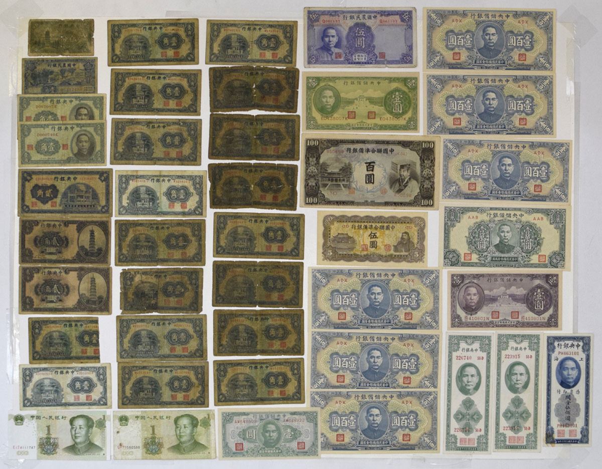 China, 1930s to 1999. Lot of 43 Issued Banknotes, Includes: Central Bank of China, ND (1924), 2 Chiao = 20 Cents, P-194a & P-194b, ABNC; ND (1931), 10 Cents = 1 Chiao, P-202 (18), CHB; ND (1931), 20 Cents = 2 Chiao, P-203, CHB; 1939, 5 Fen = 5 Cents, P-225; 1940, 1 Chiao = 10 Cents, P-226 (2), CHB; 1947, 500 CGUs, P-335, ABNC; 1947, 500 CGUs, P-336a (2), SBNC; Farmers Bank of China, 1937, 10 Cents, P-461 S/M#C290-50, TYPC; 1941, 5 Yuan, P-475 S/M#C290-81, TDLR; Peoples Republic of China, 1999, 1 Yuan, P-895a & P-895b; Central Reserve Bank of China, 1940, 1 Yuan, P-J8a; 1940, 1 Yuan, P-J9c; 1943, 1 Yuan, P-J19a; 1943, 100 Yuan, P-J23a (6); 1944, 10,000 Yuan, P-J38a; Federal Reserve Bank of China, ND (1944), 5 Yuan, P-J79 S/M#C286-72; ND (1944), 100 Yun, P-J83a. Notes range from Good to AU condition. (43). Sold "AS IS" no returns accepted.