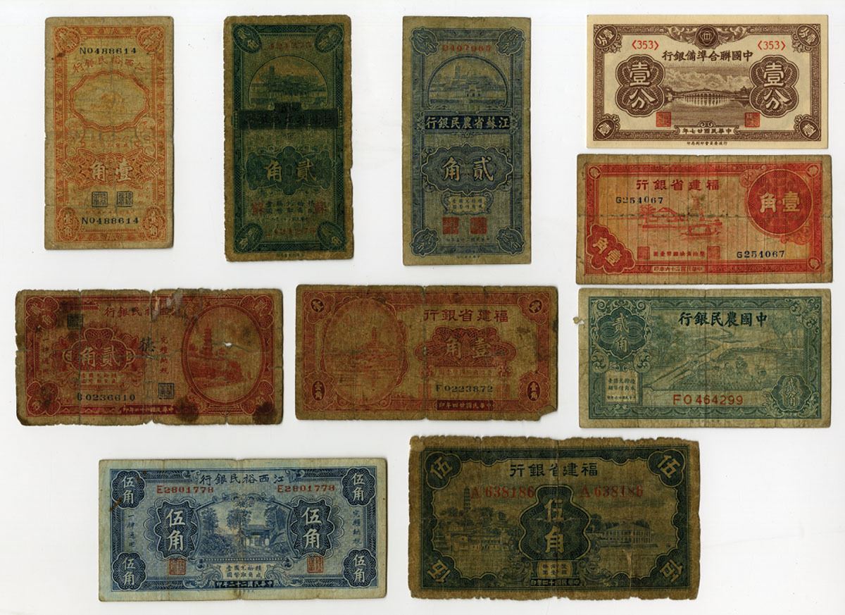 China, 1933-36. Lot of 10 Issued Banknotes from Various Issuers, Includes: Kiangsu Farmers Bank, Monetary Bureau of Government Suchow, Yu Ming Bank of Kiangsi, Farmers Bank of China, and more. Notes range from Good to XF condition. (10).