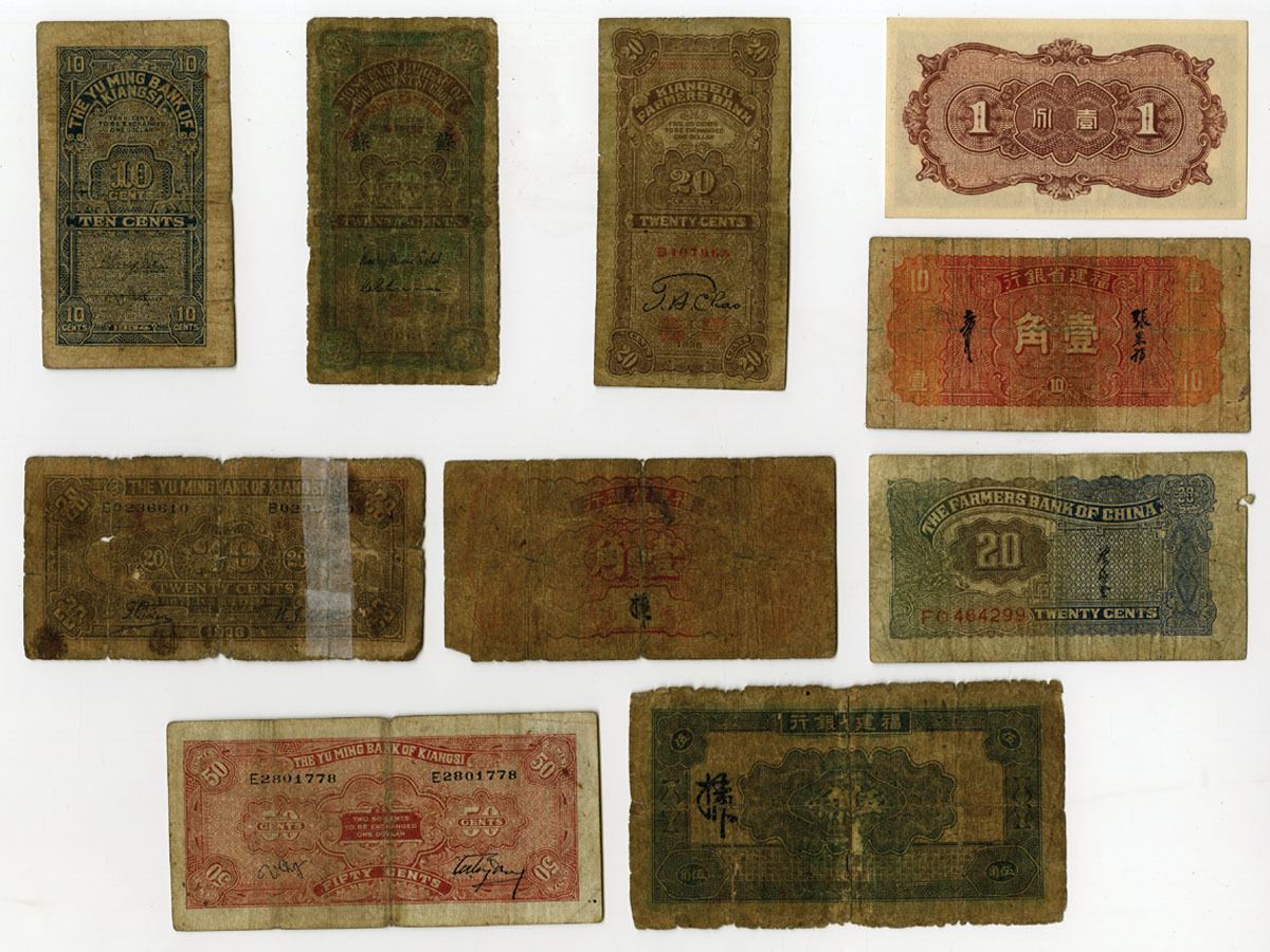 China, 1933-36. Lot of 10 Issued Banknotes from Various Issuers, Includes: Kiangsu Farmers Bank, Monetary Bureau of Government Suchow, Yu Ming Bank of Kiangsi, Farmers Bank of China, and more. Notes range from Good to XF condition. (10).
