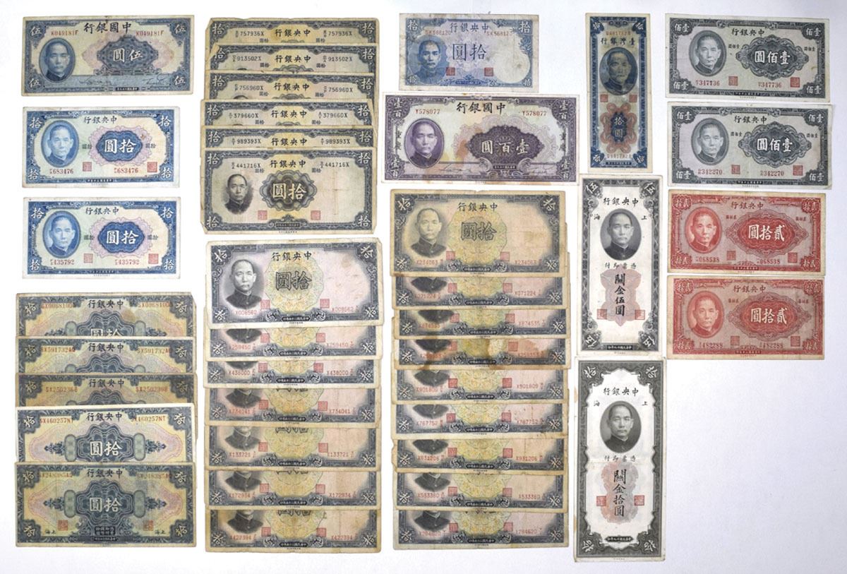 China, 1928-54. Lot of 39 Issued Banknotes, Includes: Bank of China, 1940, P-84 S/M#C294-240, ABNC; 1940, 100 Yuan, P-88b, S/M#C294-244a, ABNC; Central Bank of China, 1927, 10 Yuan, P-147Ba, S/M#C126-223, ABNC; 1928, 10 Dollars, P-197h (5), ABNC; 1936, 10 Yuan, P-214a (8), P-214b, & P-214c (7), TDLR; 1936, 10 Yuan, P-218a (4) & P-218e (2), W& S; 1941, 10 Yuan, P-239a (2), SBNC; 1941, 20 Yuan, P-240c (2), SBNC; 1941, 100 Yuan, P-243a (2), SBNC; 1930, 5 Customs Gold Units, P-326d, ABNC; 1930, 10 Customs Gold Units, P-327d, ABNC; 1954, Bank of Taiwan, 10 Yuan, P-1967 S/M#T73-32, PFBT. Notes range from Fine to AU condition. (39). Sold "AS IS" no returns accepted.