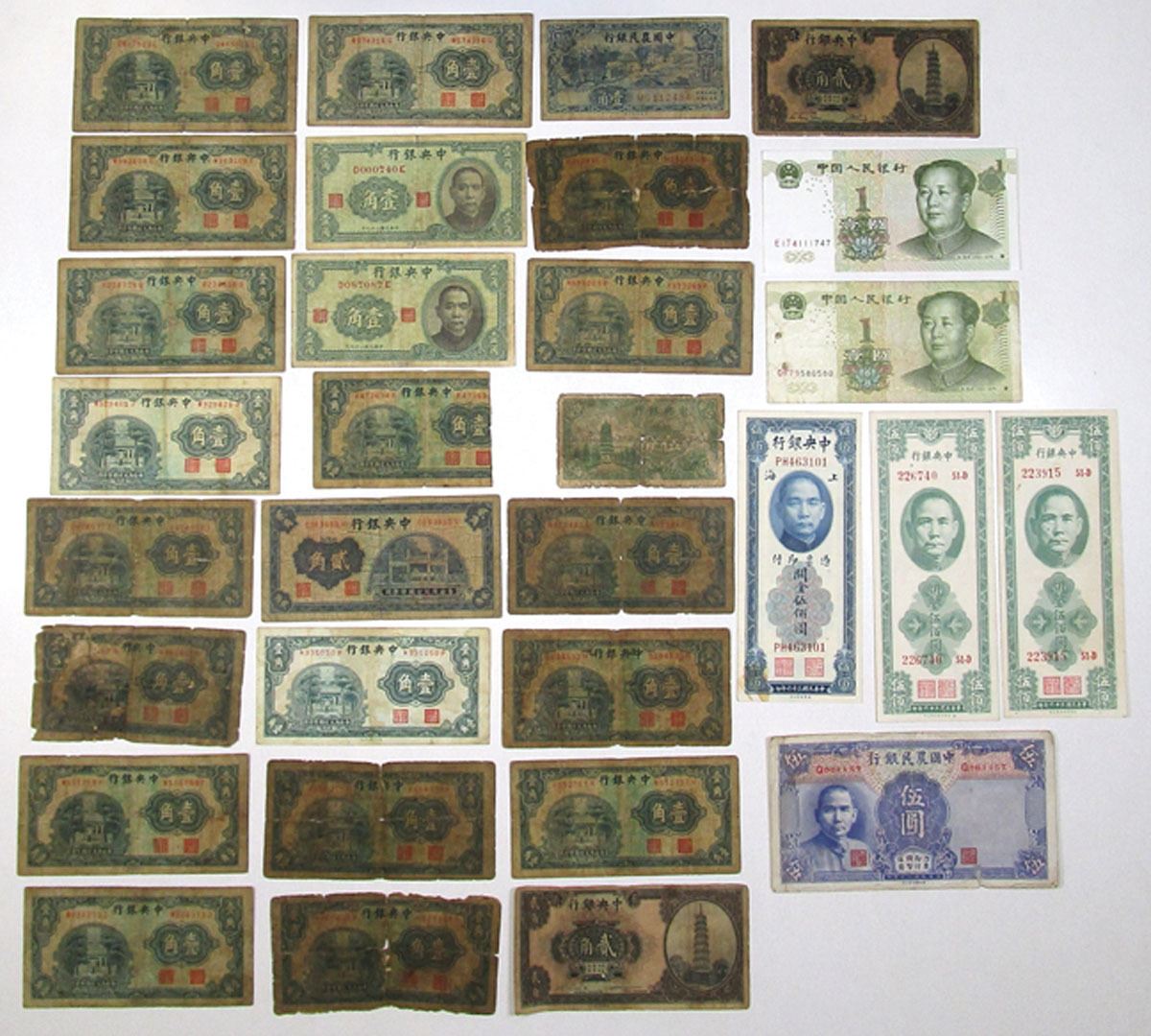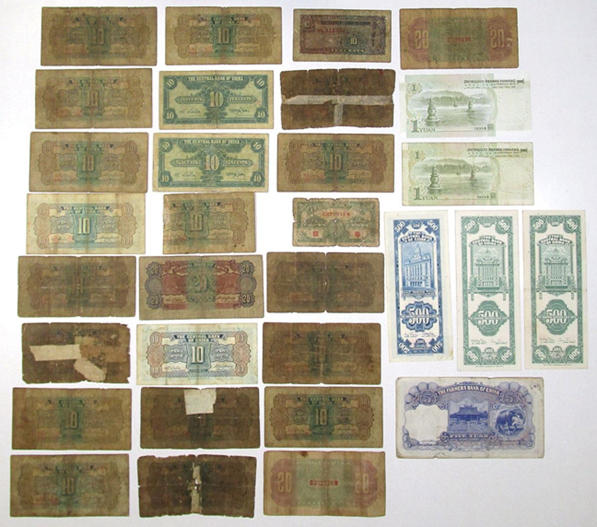 China, 1937-99. Lot of 31 Issued Banknotes from Various Issuers, Includes: Central Bank of China, ND (1924), 2 Chiao = 20 Cents, P-194a & P-194b, ABNC; ND (1931), 10 Cents = 1 Chiao, P-202 (18), CHB; ND (1931), 20 Cents = 2 Chiao, P-203, CHB; 1939, 5 Fen = 5 Cents, P-225; 1940, 1 Chiao = 10 Cents, P-226 (2), CHB; 1947, 500 CGUs, P-335, ABNC; 1947, 500 CGUs, P-336a (2), SBNC; Farmers Bank of China, 1937, 10 Cents, P-461 S/M#C290-50, TYPC; 1941, 5 Yuan, P-475 S/M#C290-81, TDLR; Peoples Republic of China, 1999, 1 Yuan, P-895a & P-895b. Notes range from Good to XF condition. (31). Sold "AS IS" no returns accepted.