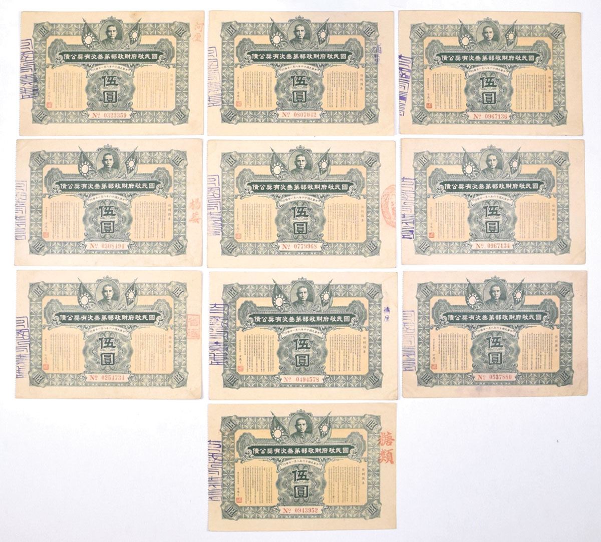 China, 1927. Lot of 10 I/U Lottery Bonds, Black with green print and peach underprint, SYS at top center, VF to XF condition, (10). Sold "AS IS" no returns accepted.
