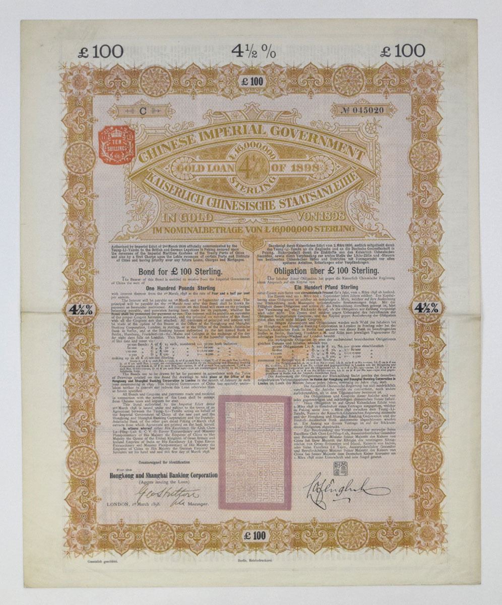 China, 1898. £100, I/U 4 1/2% Gold Coupon Bond, Kuhlmann 81, Black print with ornate brown border with pink, blue, and orange underprint, Company title at top, Printed in English and German, VF to XF condition. Issued under the Chinese Imperial Government’s 1898 Anglo-German loan during the reign of the Guangxu Emperor, this bond was part of China’s effort to raise funds for railway construction and modernization following the Sino-Japanese War indemnities. Arranged through the Deutsch-Asiatische Bank and the Hongkong and Shanghai Banking Corporation, it marked one of the earliest large-scale international loans floated jointly by European banks for China. These bonds circulated widely in European markets and are a cornerstone of late-Qing foreign loan issues.