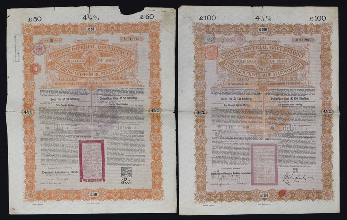 China, 1898. Lot of 2 I/U Bonds, Includes: £50 4 1/2% Gold Bond with orange border and £100 Pounds 4/12% Gold Bond with brown border. Both are printed in English and German and range from Fine to VF condition with faults and tears on margins. G&D. (2). Sold "AS IS" no returns accepted.
