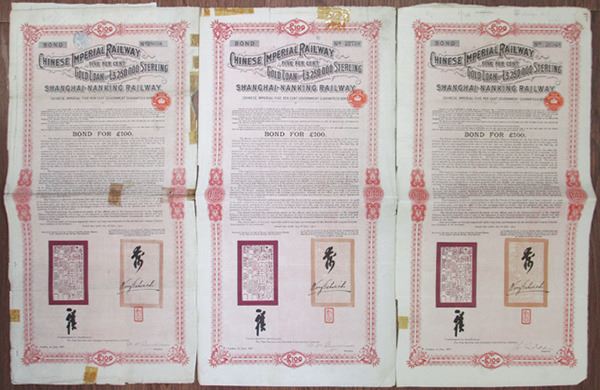 China, Lot of 3 bonds, all are 1907, £100, I/U 5% Shanghai-Nanking Railway Gold Coupon Bonds, Government Guaranteed, Black text with red border and pink undertint. Fine condition with minor margin issues. 3 pieces.