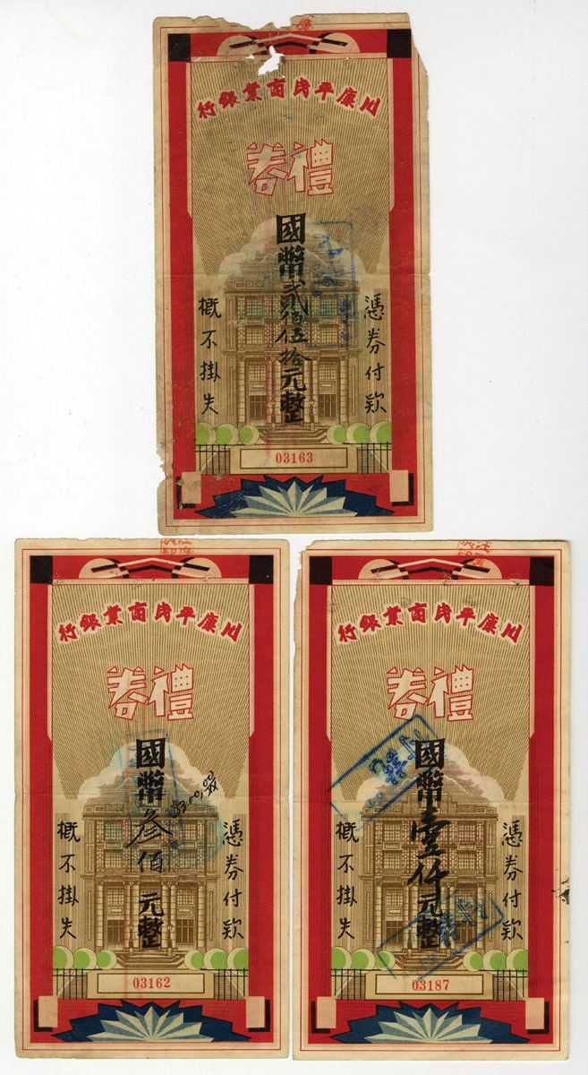 China, Lot of 3 bonds-banknotes. Includes $200; $300; $1000, P-Unlisted, S/M#C237-?, All red with brown, green and black, building in middle, backs brown with small text, the $200 bond-note has missing paper on corners, top and side, the balance are VF to XF condition.