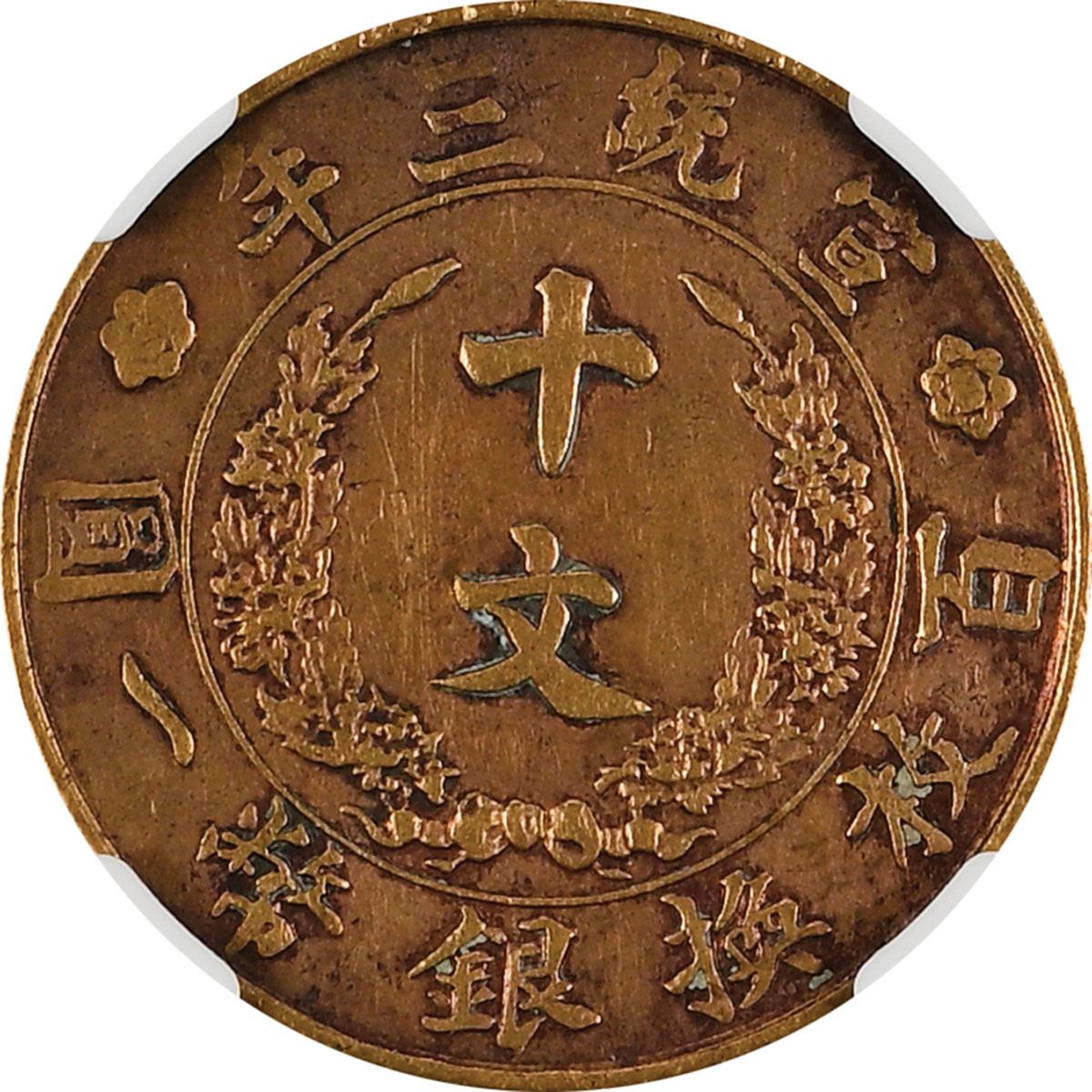 China: Empire, 10 Cash, YR3 (1914), NGC Graded XF Details (HARSHLY CLEANED).