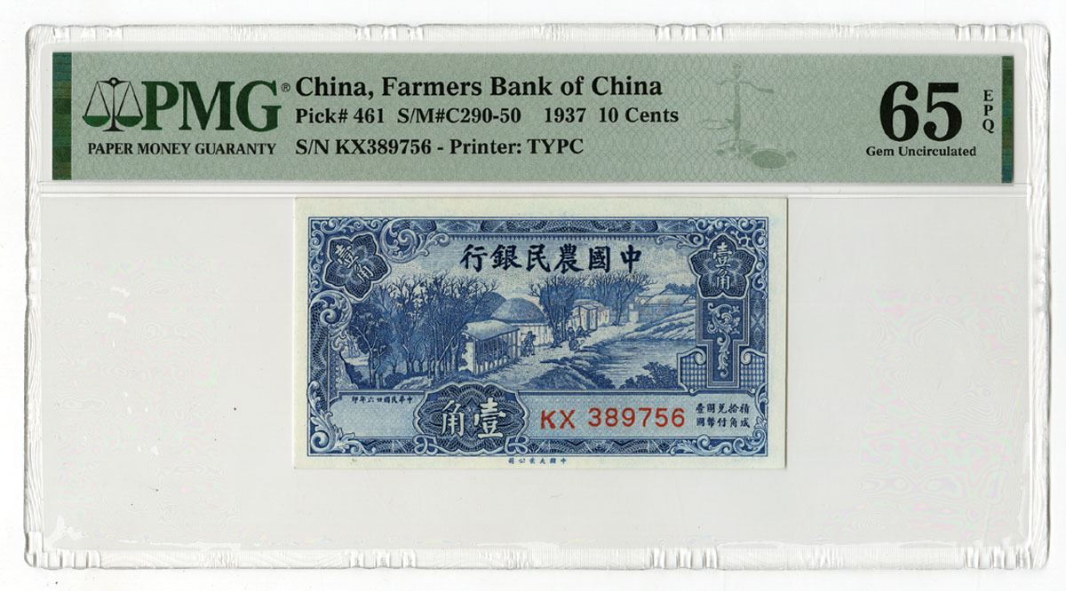 China, 1937. 10 Cents, P-461 S/M#C290-50, Issued Banknote, Dark blue and light blue underprint with landscape scene at center, Back is brown and m/c, S/N KX389756, PMG graded Gem Uncirculated 66 EPQ, TYPC.