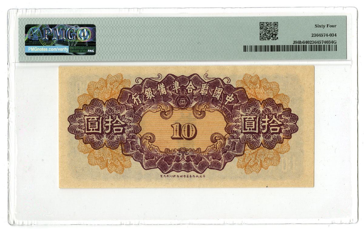 China, ND (1945). 10 Yuan, P-J86b S/M#C286-76, Issued Banknote, Violet on light brown with Kuan-yu at left and ruins at right, Back is purple and orange with denomination at center, Block 6, PMG graded Choice Uncirculated 64. NCGA.