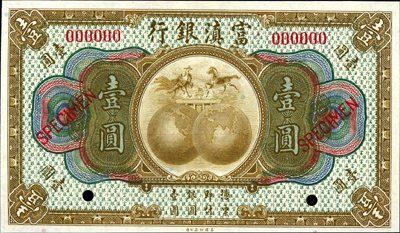 ND, 1921. P-S3014 Unlisted. $1. Specimen banknote. Phoenix and horse face each other above globe. Light brown border with blue green undertint with green back. Red specimen overprint, POC's and "000000" serial numbers. Uncirculated note. ABNC