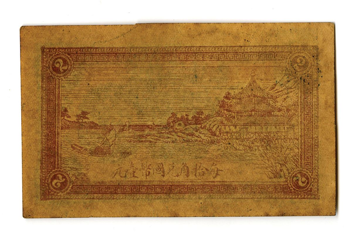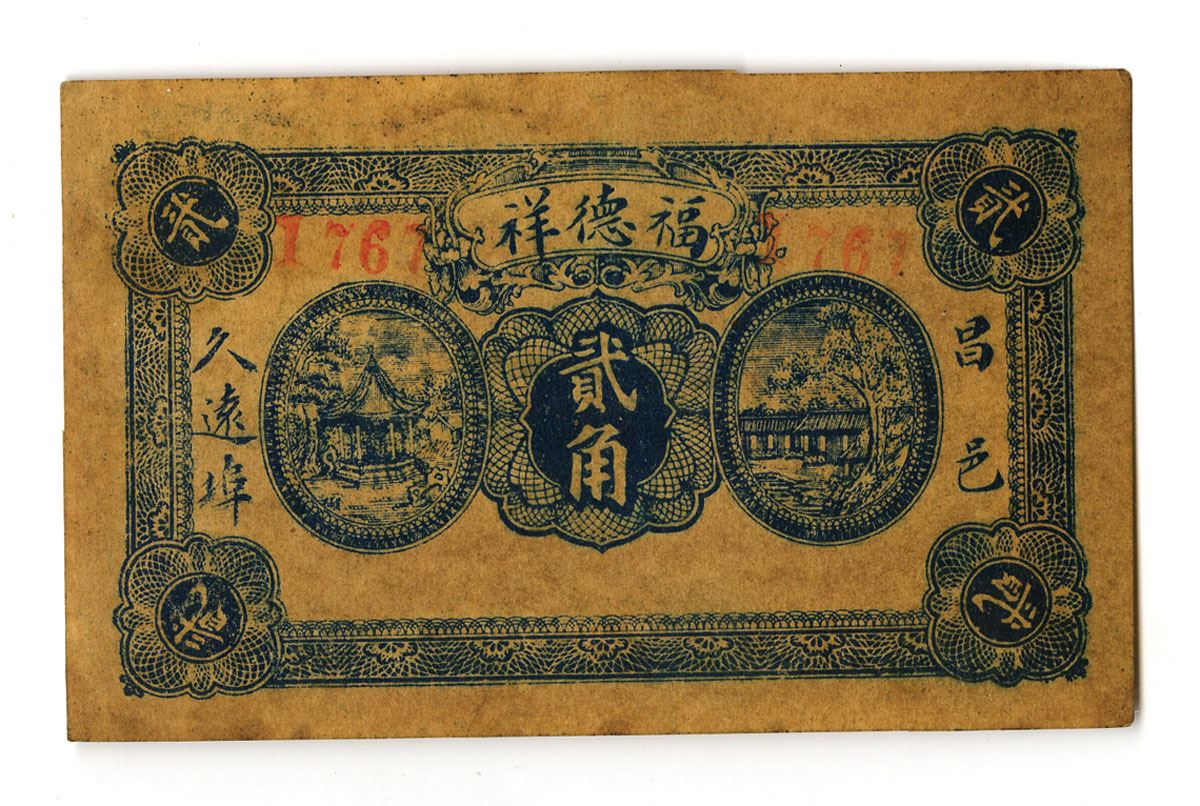 Privately issued 2 jiao note from Fude Xiang Trading House with scenic vignettes. Commercial seals symbolize prosperity, abundance, peace, and fortune. Red serial number, mottos of honest trade. Reverse shows riverbank scene with temple complex; printing style suggests circa 1920s–1930s merchant circulation.