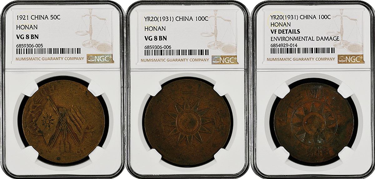 China: Honan Province, Trio of coins, includes 50 Cash, 1921, NGC Graded VG 8 BN; 100 Cash, Year 20 (1931), NGC Graded VG 8 BN; and 100 Cash, Year 20 (1931), Y-398, NGC Graded VF DETAILS - ENVIRONMENTAL DAMAGE. (3)