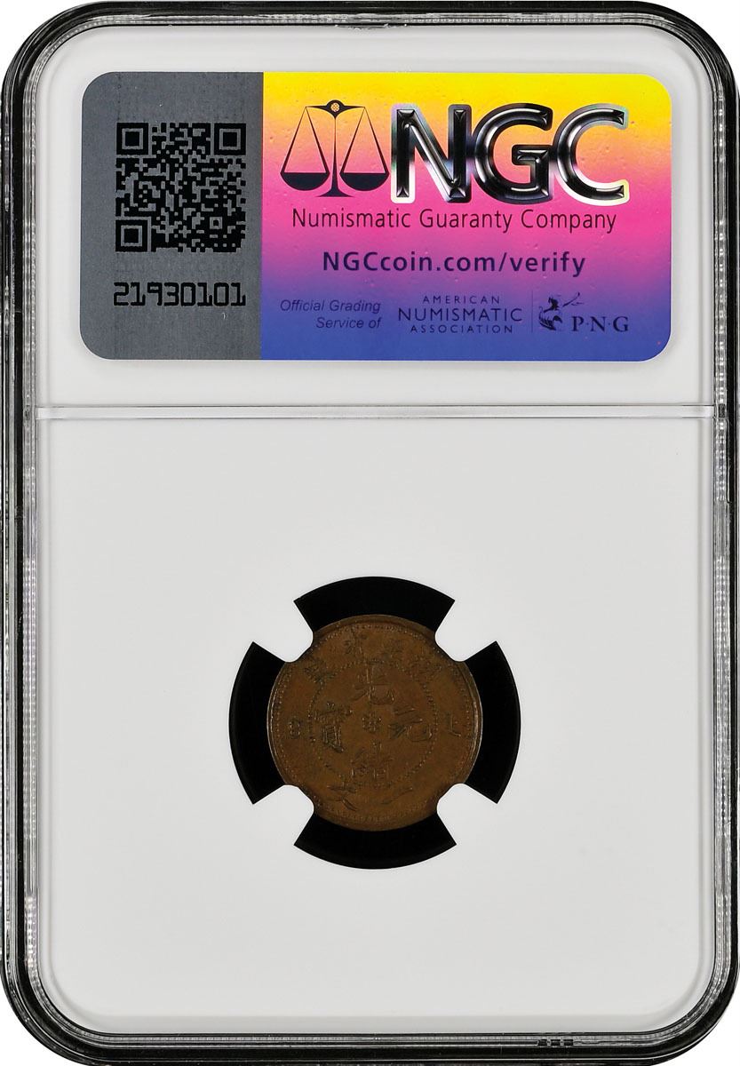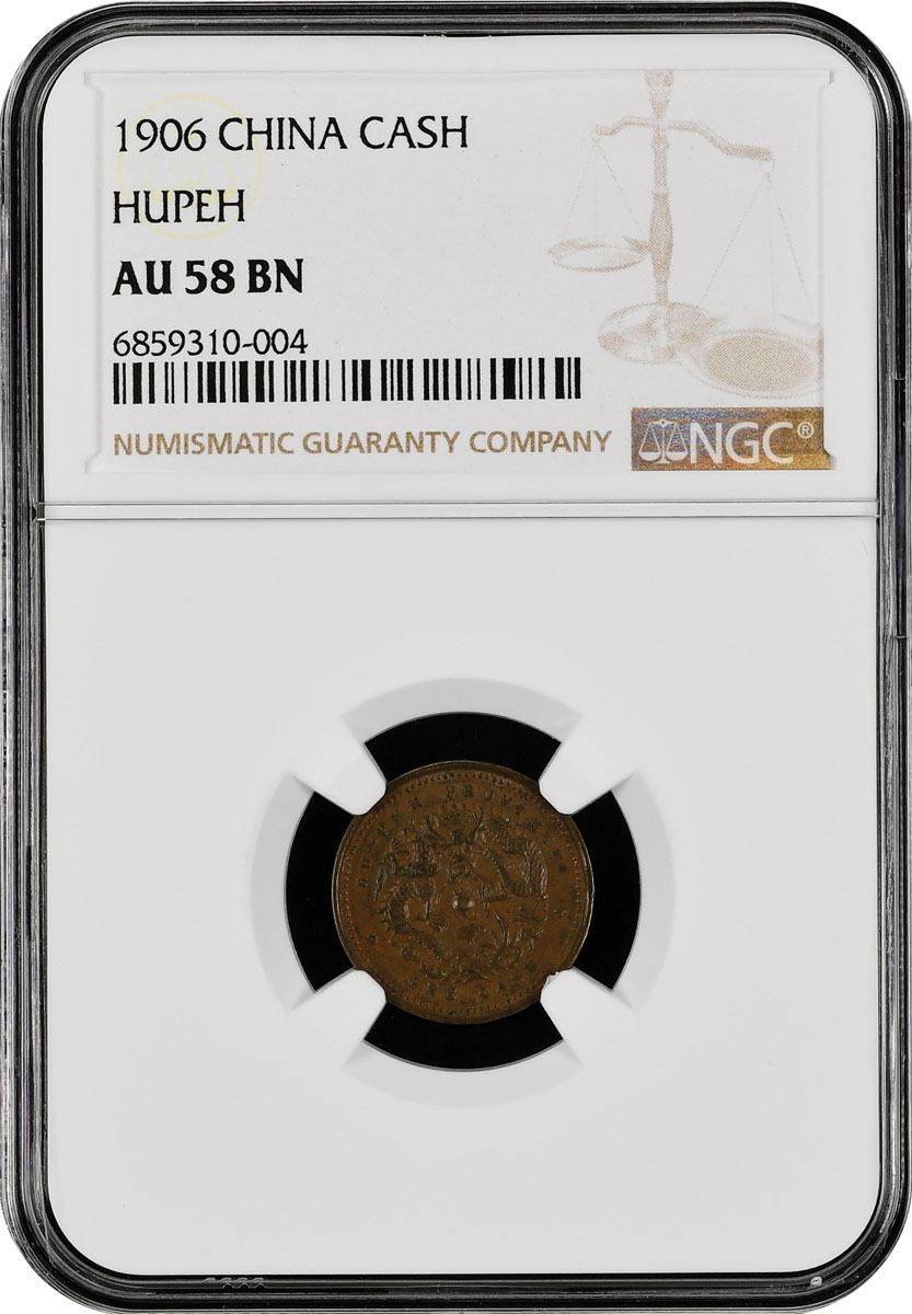 China: Hupeh Province, 1 Cash, 1906, NGC Graded AU 58 BN. This coin is embraced by a warm, chestnut-brown patina, with subtle mahogany undertones that enhance its aesthetic appeal. The delicate interplay of light across its surfaces hints at the original mint luster, lingering beneath the patina, endowing the piece with an understated yet captivating brilliance.