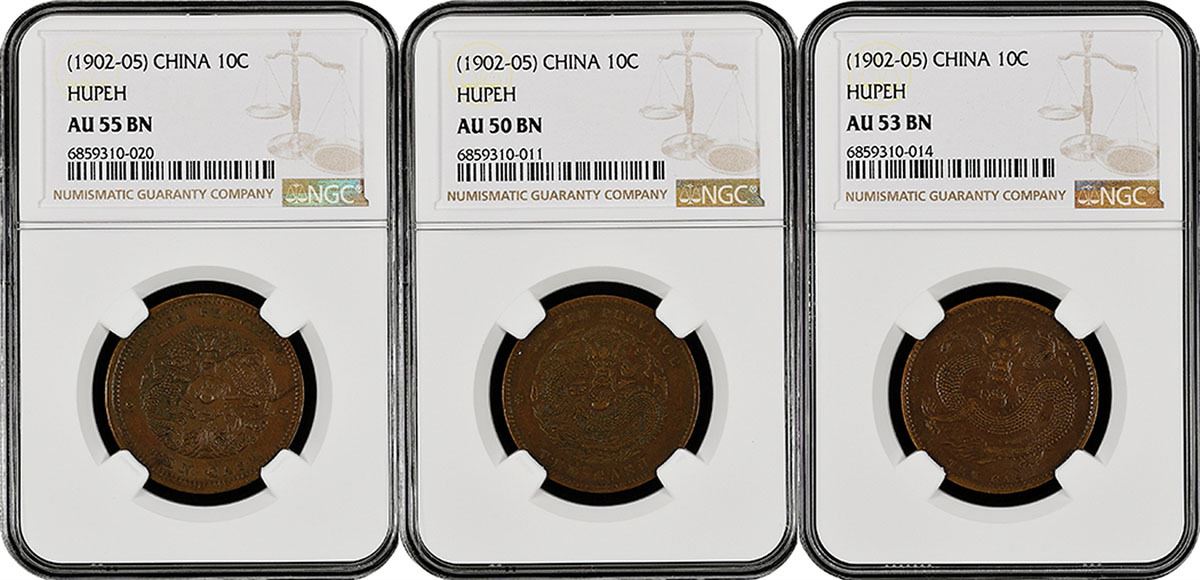 China: Hupeh Province, Trio of 10 Cash, (1902-05), Copper, Y-120, NGC Graded AU 50 BN, AU 53 BN, and