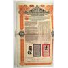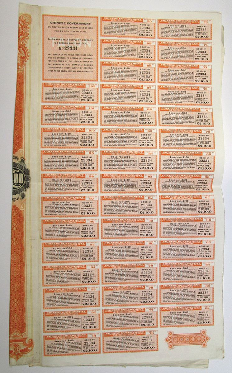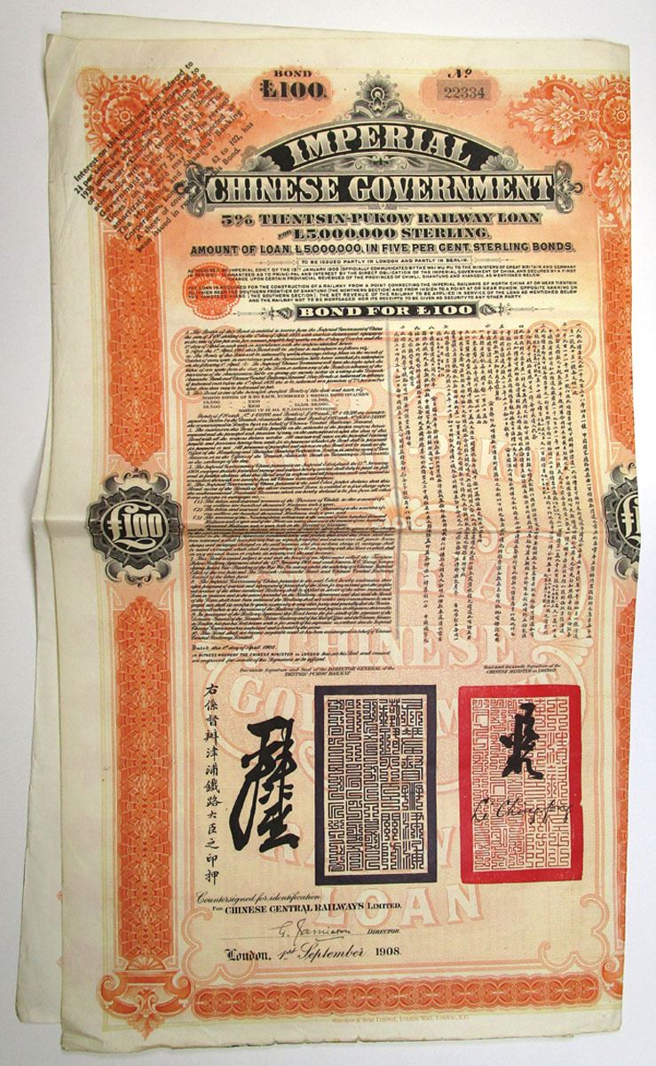 China, 1908. £100, I/U 5% Coupon Bond, Ornate purple border and green underprint with British and German tax stamps at top, Title printed in German, bond printed in German and Chinese, Fine to VF+ condition with staple holes and some edge roughness. Giesecke & Devrient.