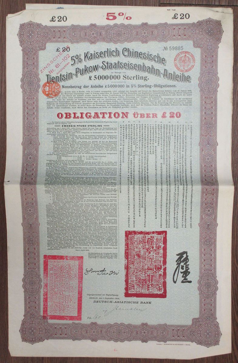 China. 1908, £20 I/U 5% Coupon Bond, lilac border on blue-green under print with coupons. G&D. Very Fine.