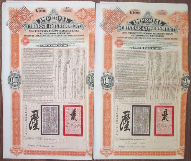 China, Lot of 2 bonds, Both are 1908, £100 I/U 5% Sterling Coupon Bond, Black text with orange border and undertint. Fine condition with worn margins. Printed by Waterlow & Sons Ltd. 2 pieces.
