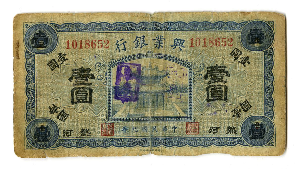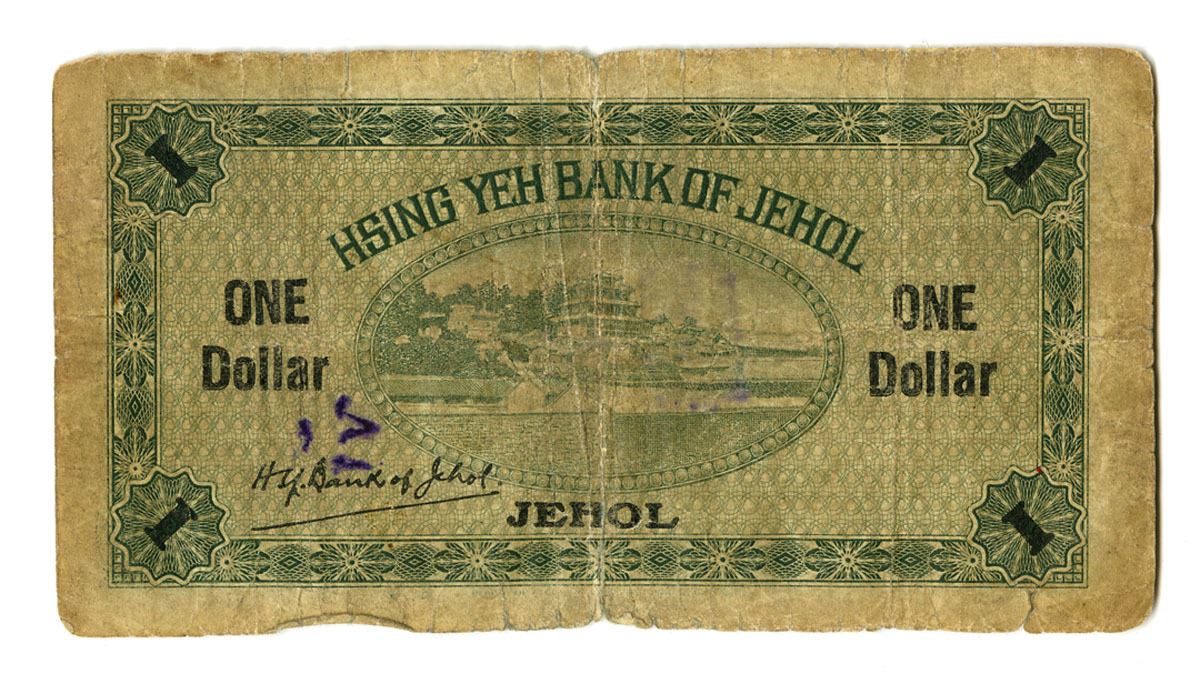 Jehol, China, 1920. 1 Dollar, P-S2169a, Issued Banknote, Blue and black print with building at center, Back is green with pagoda, Chinese on face and English on back, S/N 1018652, Good to Fine condition, BEPP.