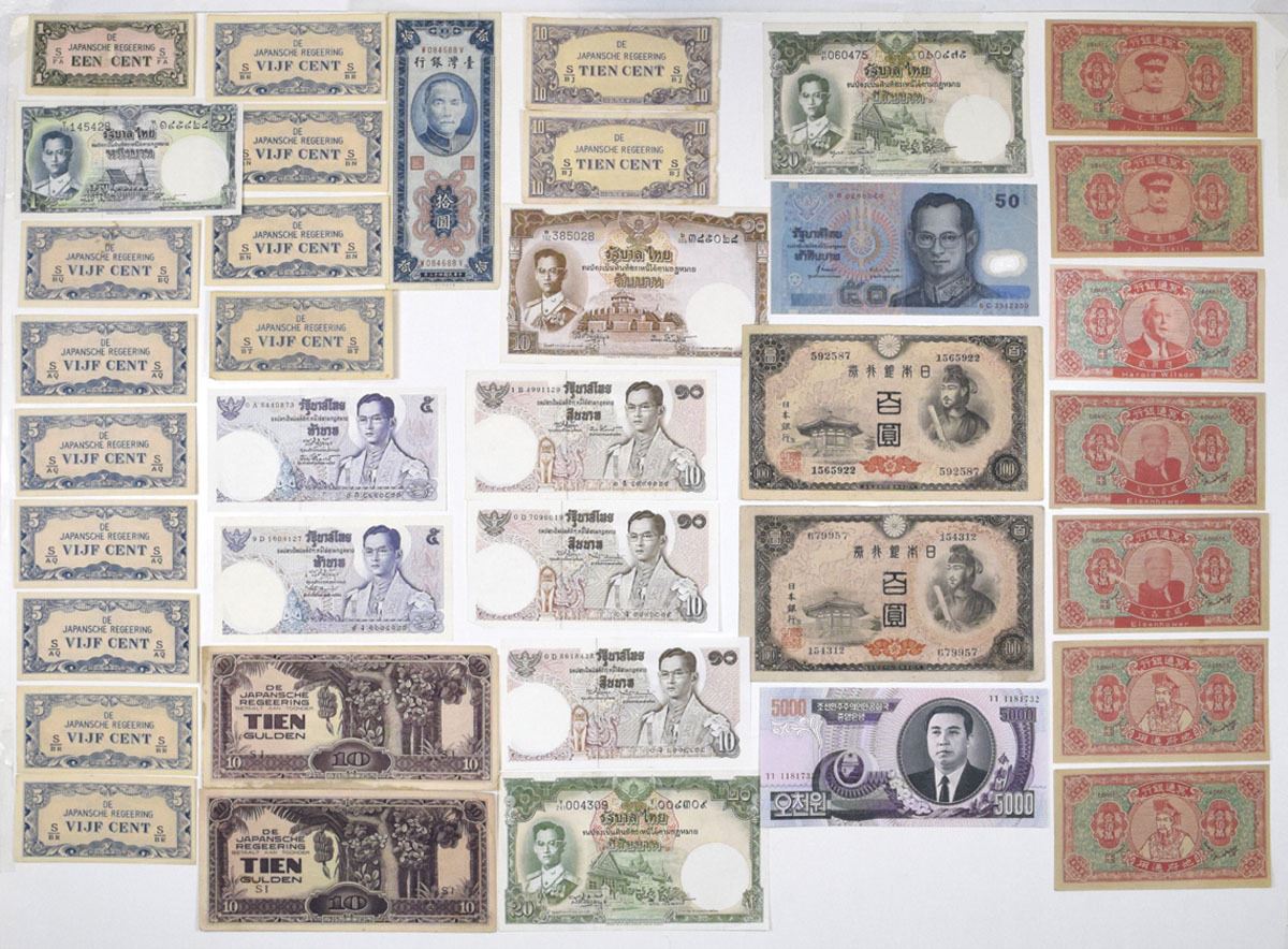 China, Japan, Thailand and Asia Area, 1940-2000s. Lot of 35+ Issued Banknotes from China, Japan, Japanese Occupation of the Netherlands, North Korea, Taiwan, Thailand: Hell Bank Notes, ND (1960s), with Eisenhower, Wilson, and Stalin (7); Bank of Japan, ND (1946), 100 Yen, P-89 (2); Japanese Occupation WWII - Netherlands Indies, ND (1942), 1 Cent, P-119b; ND (1942), 5 Cents, P-120c (11); ND (1942), 10 Cents, P-121c (2); ND (1942), 10 Gulden, P-125c (2); Democratic Peoples Republic Korean Central Bank, 2002, 5000 Won, P-46b; Bank of Taiwan, 1954, 10 Yuan, P-167 S/M#T73-32; Government of Thailand, 1 Baht, P-74c; ND (1953), 10 Baht, P-76d; ND (1953), 20 Baht, P-77d (2); Bank of Thailand, ND (1969), 5 Baht, P-82 (2); ND (1969-78), 10 Baht, P-83a (3); ND (1997), 50 Baht, P-102a. Notes range from Fine to AU condition. (35+). Sold "AS IS" no returns accepted.