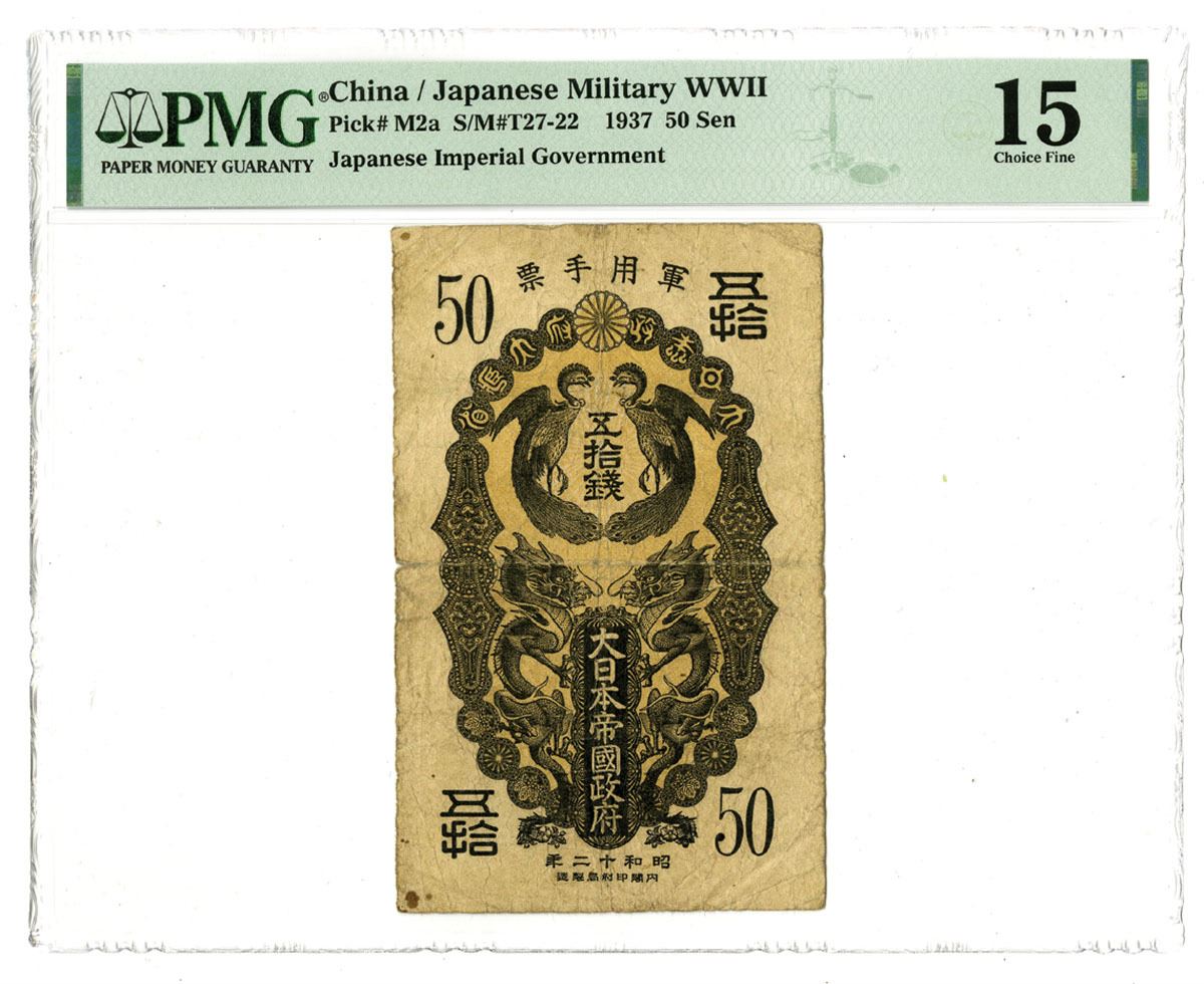China - Japanese Military WWII, Yr.12 (1937). 50 Sen, P-M2a S/M#T27-22, Issued Banknote, Black on yellow underprint with facing Onagadori cockerels at top with two facing dragons at bottom, Back is yellow with red seal at bottom, No S/N, PMG graded Choice Fine 15.