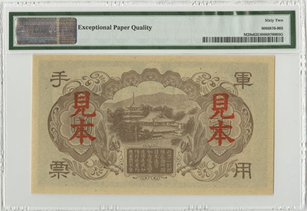 China / Japanese Military. 100 Yen, P-M29s, S/M#T32-5, Specimen banknote, "Mi-hon" overprint, Block 1, 4 characters overprint, PMG graded Uncirculated 62 EPQ.