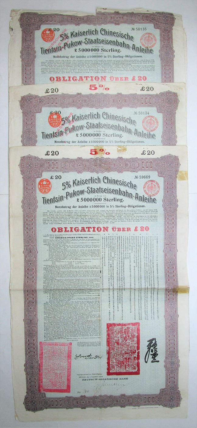 China, 1908. Lot of 3, £20, I/U 5% Coupon Bond, Ornate purple border and blue underprint with British tax at top, Title printed in German at top, Printed in German, and Chinese, All but one bond has coupons attached. VG to Fine condition, some edge roughness. 3 pieces.