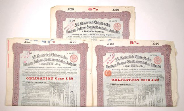 China, 1908. £20, I/U 5% Coupon Bond, Black with ornate purple border and blue underprint, Certificate printed in German and Chinese, Coupon page attached. Fine-VF condition with some edge roughness. Giesecke & Devrient.