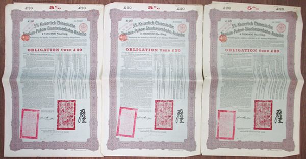 China. Kaiserlich Chinesische Tientsin-Pukow, S.A. 1908, £20, I/U Bond Trio