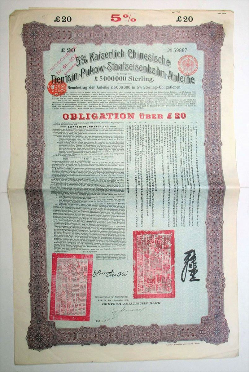 China, 1908. £20, I/U 5% Coupon Bond, Ornate purple border and blue underprint with British tax at top, Title printed in German at top, Printed in German, and Chinese, Fine-VF condition with staple holes, minor rust, and some edge roughness. Giesecke & Devrient.