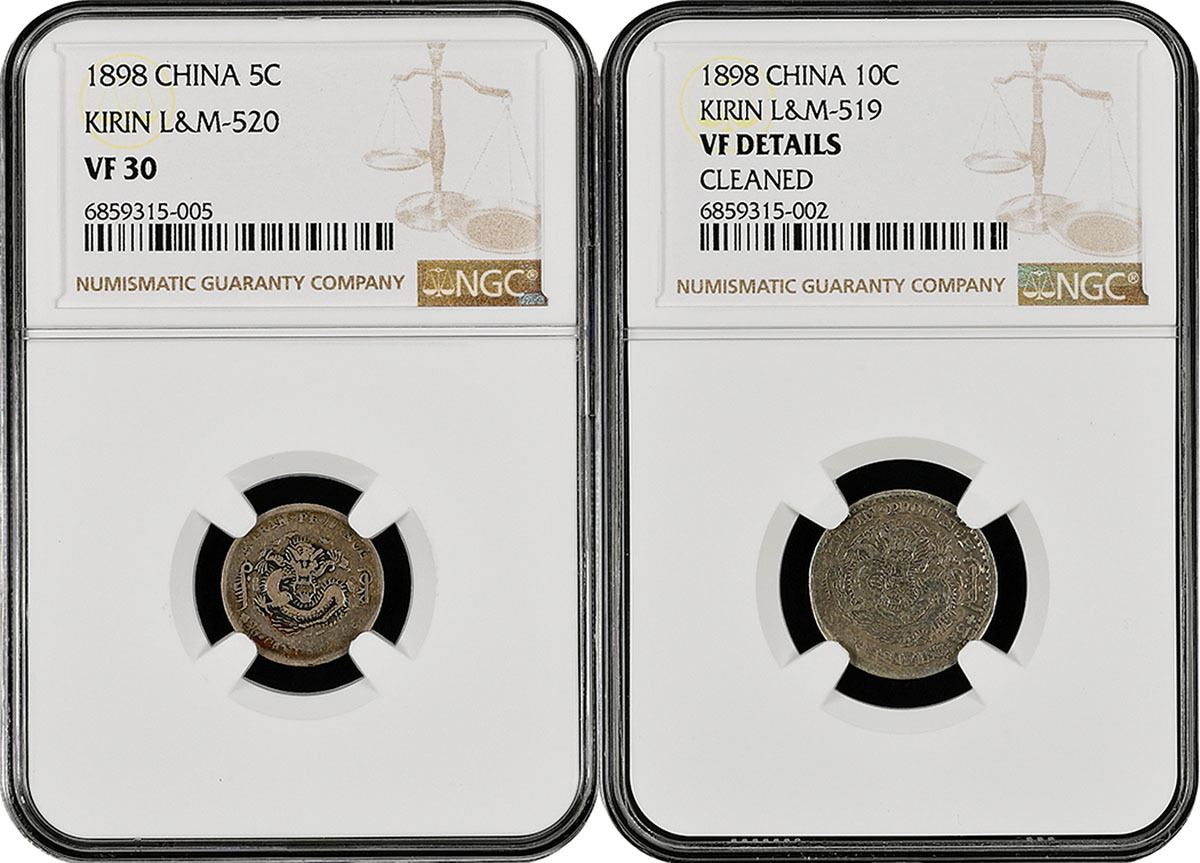 China: Kirin Province, Pair of coins, includes 5 Cents, 1898, L&M-520, NGC Graded VF 30; and 10 Cents, 1898, L&M-519, NGC Graded VF Details (CLEANED). (2)