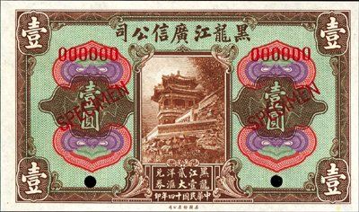 1925. P-S1614 Unlisted. $1. Specimen banknote. "Remittance Note - One Dollar - Big Money of Heilungchiang Currency". Hillside shrine vignette. Brown border with green undertint. This is the base note without the10 Chinese characters found on the note blacked out for this series. Red specimen overprint, POC's and "000000" serial numbers. Rare note that is unpriced in SCWPM.. ABNC