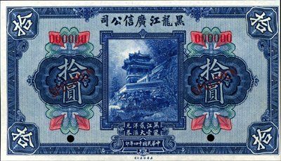 1925. P-S1614B Unlisted Trial Color. $10. Specimen Trial Color banknote. "Remittance Note - One Dollar - Big Money of Heilungchiang Currency". Hillside shrine vignette. Blue border with blue undertint. This note is completely unlisted in SCWPM in this color. Red specimen overprint, POC's and "000000" serial numbers. Uncirculated note with margin cut close to the right margin. Rare note that is unlisted and unpriced in SCWPM. ABNC