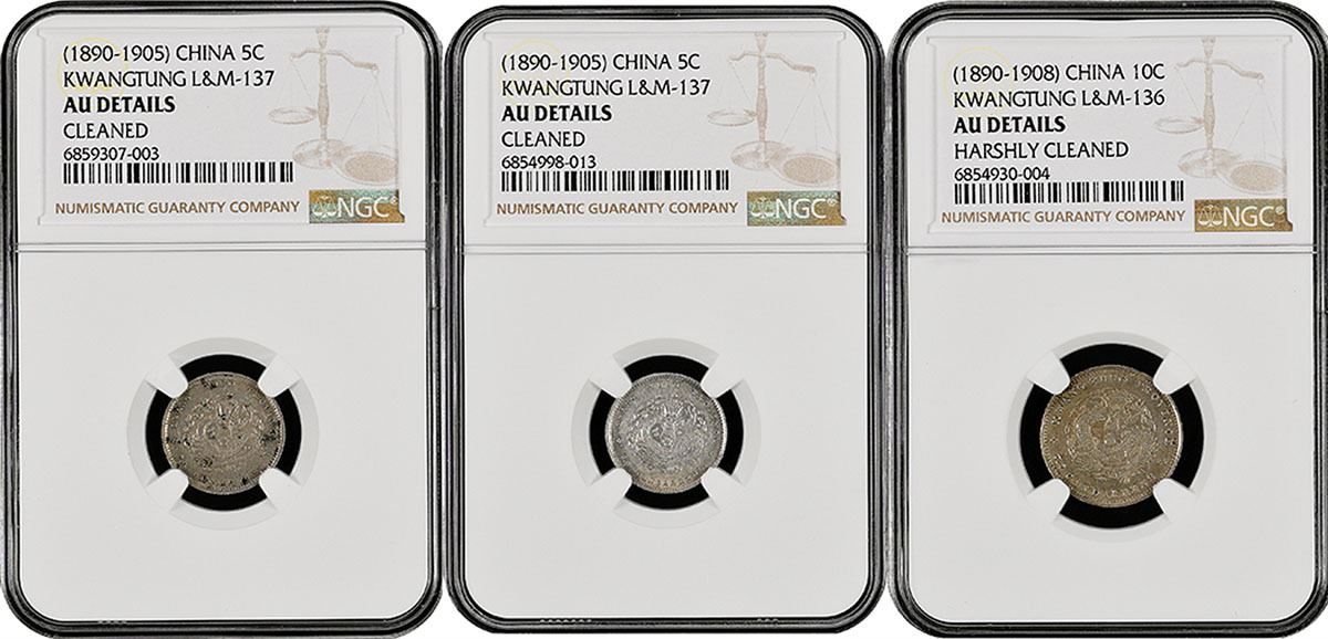 China: Kwangtung Province, Lot of 3 coins, includes two 5 Cents, (1890-1905), L&M-137, both NGC Graded AU DETAILS - CLEANED; and a 7.2 Candareens (10 Cents), (1890-1908), L&M-136, Kwangtung Mint, Kuang-hsu (Guangxu), NGC Graded AU DETAILS - HARSHLY CLEANED. (3)