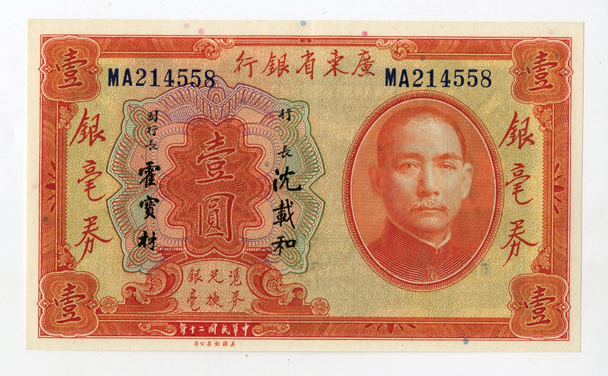 China, 1931. 1 Yuan, P-S2421 S/M#K56-1, Issued Banknote, Orange on m/c underprint with SYS at right, S/N MA215448, AU to UNC condition, ABNC.