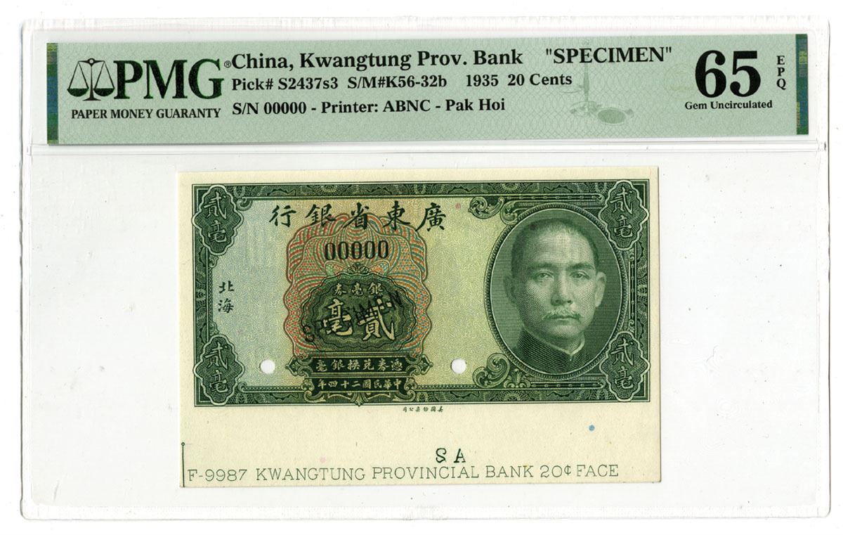 Pak Hoi, China, 1935. 20 Cents, P-S2437s2 S/M#K56-32a, Specimen Banknote, Green on m/c underprint with SYS at right, Back is green with sampan and junk at center, Specimen overprint and POCs, S/N 00000, PMG graded Gem Uncirculated 65 EPQ with comment "Selvage Included," ABNC.