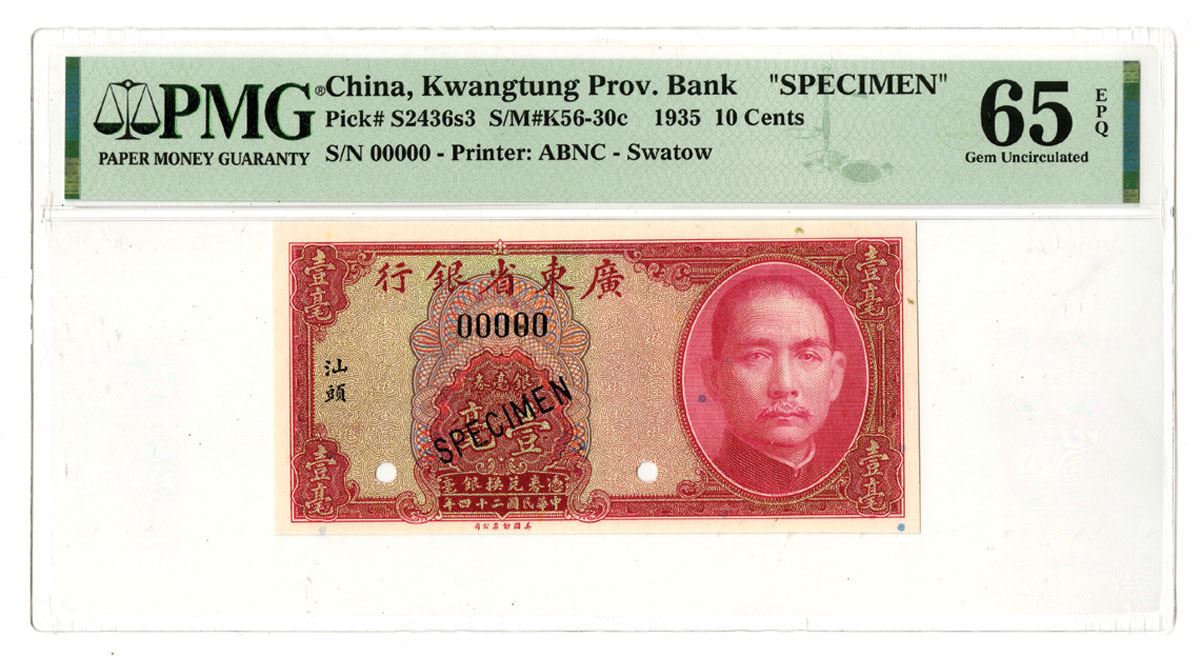 Swatow, China, 1935. 10 Cents, P-S2436s3 S/M#K56-30c, Specimen banknote, Red on m/c underprint with SYS at right, Back is red with sampan and junk at center, Specimen overprints and POCs, S/N 00000, PMG graded Gem Uncirculated 65 EPQ, ABNC.