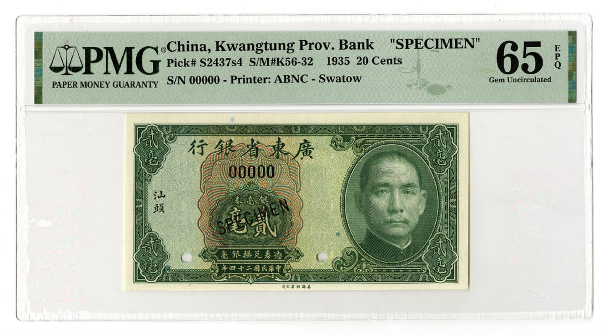 Swatow, China, 1935. 20 Cents, P-S2437s4 S/M#K56-32, Specimen Banknote, Green on m/c underprint with SYS at right, Back is green with sampan and junk at center, Specimen overprints and POCs, S/N 00000, PMG graded Gem Uncirculated 65 EPQ, ABNC.