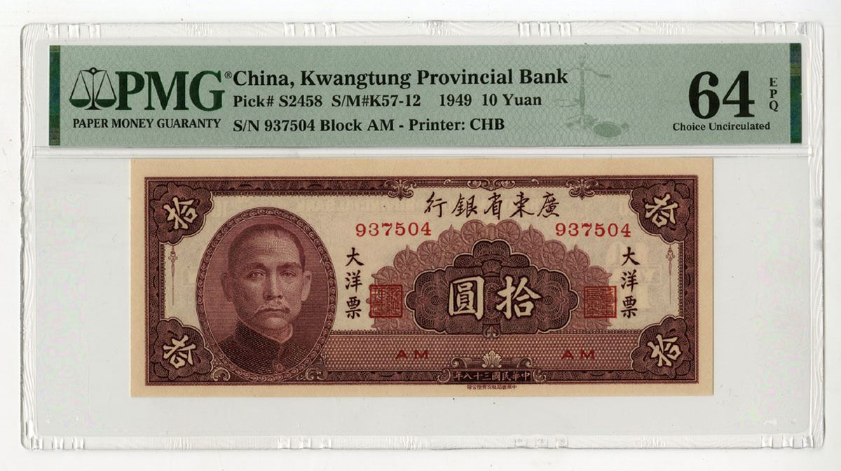 China, 1949. 10 Yuan, P-S2458 S/M#K57-12, Issued Banknote, Maroon printing with SYS at left, Back is maroon with large building at center, S/N 937504 Block AM, PMG graded Choice Uncirculated 64 EPQ, CHB.