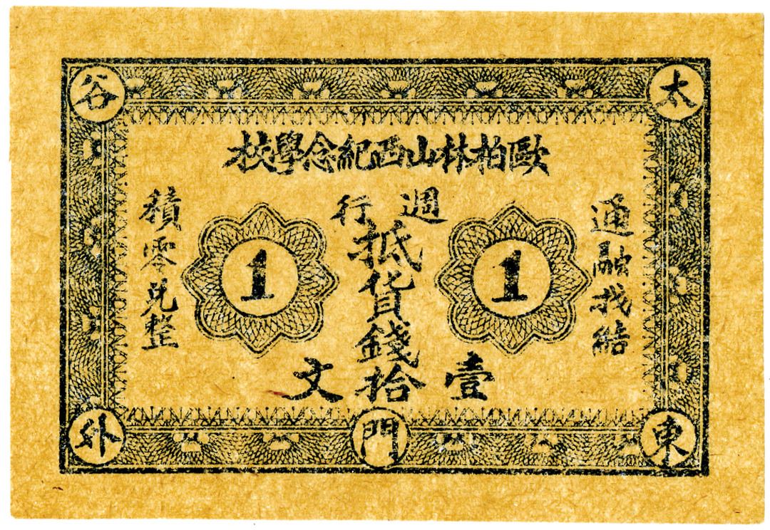 China, ca.1900-20, Private School Scrip Note. Blue on thin translucent paper, Uncirculated, Rare. From the estate of an American missionary from the South who was in China from 1900 to 1920.