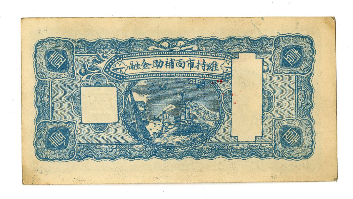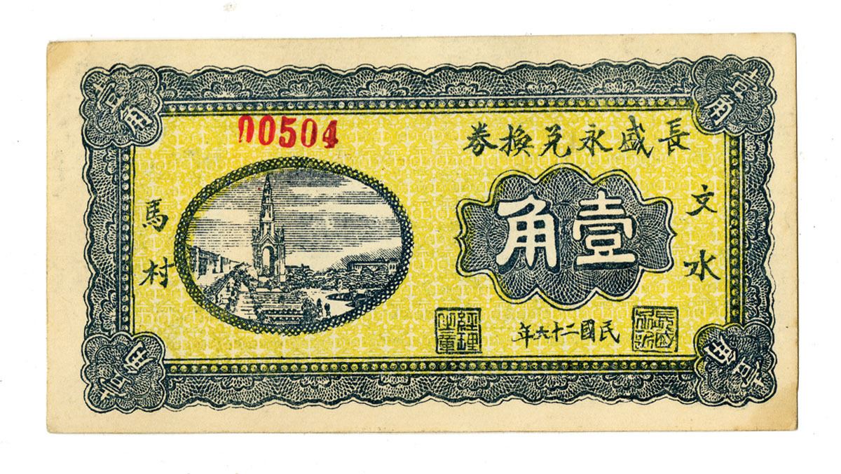 China, 1943; 1 jiao merchant note issued by Changsheng Yongguang Piao, locality Ma Village. Monument vignette front; harbor reverse. Condition: VF to XF.