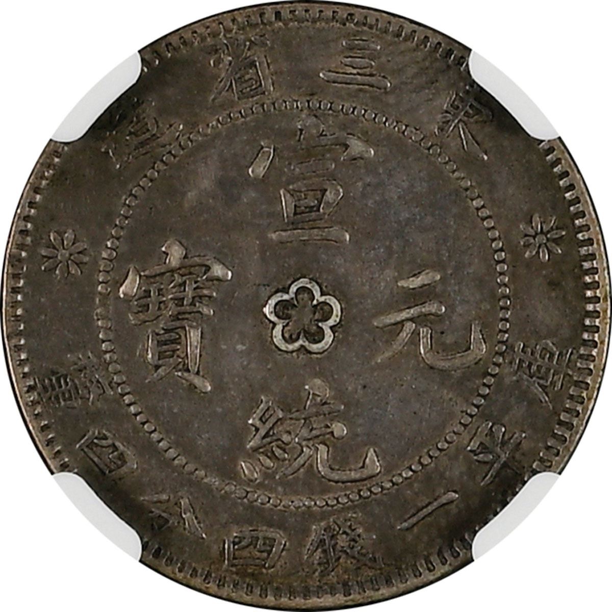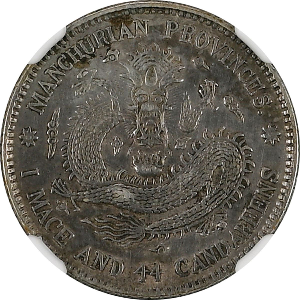 China: Manchuria, 1 Mace and 44 Candareens (20 cents), (1914-15), L&M-497, Silver. NGC Graded AU DETAILS - CLEANED. Silvery light reflects off this smoky gray-brown obverse; The reverse is more uniformly colored, with center flower-image set off by silver highlights.