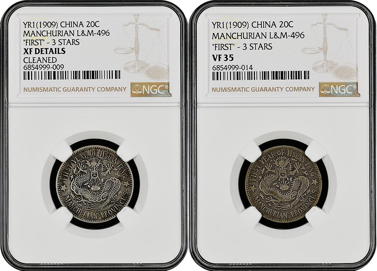 China: Manchuria, Pair of 1 Mace and 44 Candareens (20 cents), Year 1 (1909), L&M-496, NGC Graded XF DETAILS - CLEANED and VF 35. (2)