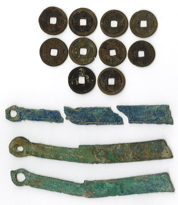 China, Lot of 3 knife currency, 1 broken into 3 pieces, all are fragile and 10 coins. Scarce early Chinese coins.