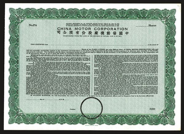China (Incorporated in Panama), Odd Shares, “Class A Stock”, No overprints, serial numbers or other marks, black text on green underprint, Each China automobile company.