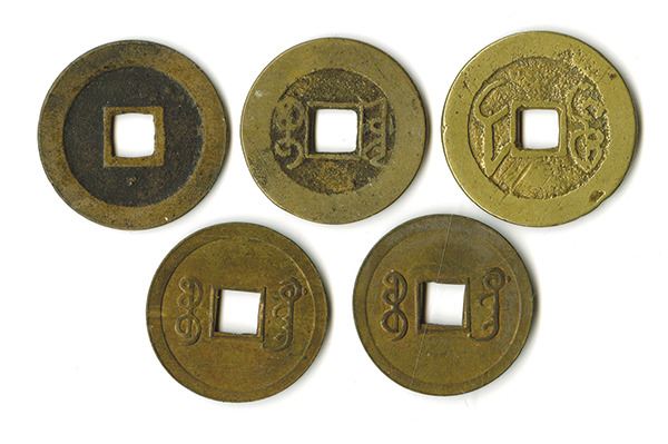China, lot of 5 Cash coins from the late 1800s, generally F-VF condition.