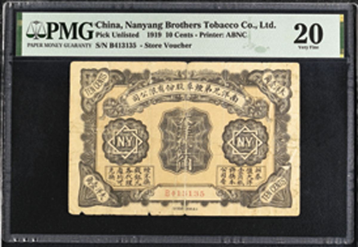 China, 1919. 10 Cents, P-Unlisted, Issued Store Voucher, Black on yellow with Chinese and English text, Back is blue with red circular seal at top right corner, S/N B413135, PMG graded Very Fine 20 with comment "Splits."