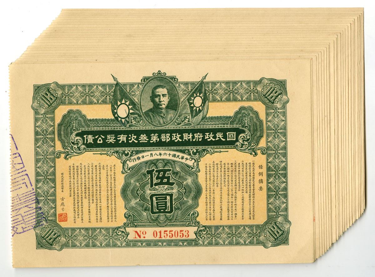 China, 1927. 5 Yuan (24), I/U Nationalist Government Lottery Loans, Green print with tan underprint, Chinese text at left and right with portrait of SYS at top center, Back is orange and yellow with English text, Condition ranges from XF to AU condition. (24). Sold "AS IS" no returns accepted.