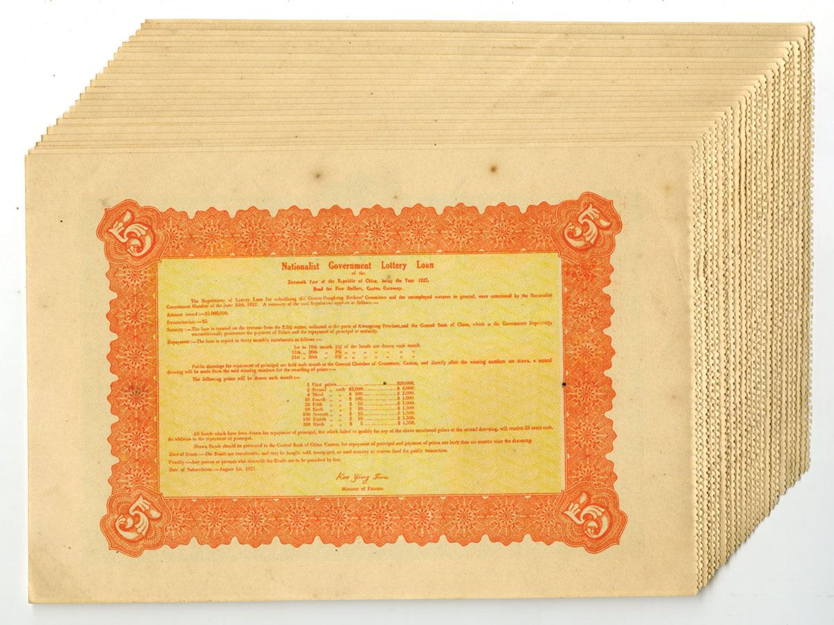 China, 1927. 5 Yuan (24), I/U Nationalist Government Lottery Loans, Green print with tan underprint, Chinese text at left and right with portrait of SYS at top center, Back is orange and yellow with English text, Condition ranges from XF to AU condition. (24). Sold "AS IS" no returns accepted.