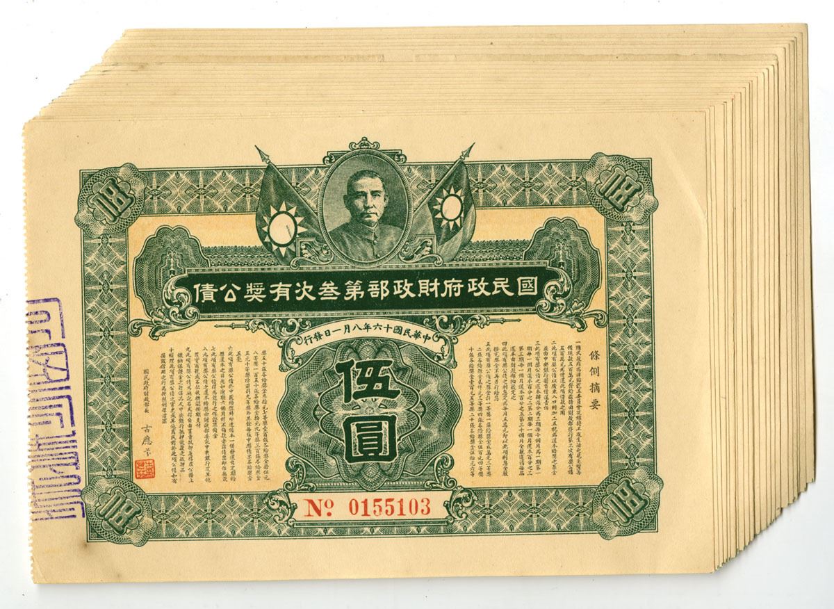 China, 1927. 5 Yuan (24), I/U Nationalist Government Lottery Loans, Green print with tan underprint, Chinese text at left and right with portrait of SYS at top center, Back is orange and yellow with English text, Condition ranges from XF to AU condition. (24). Sold "AS IS" no returns accepted.
