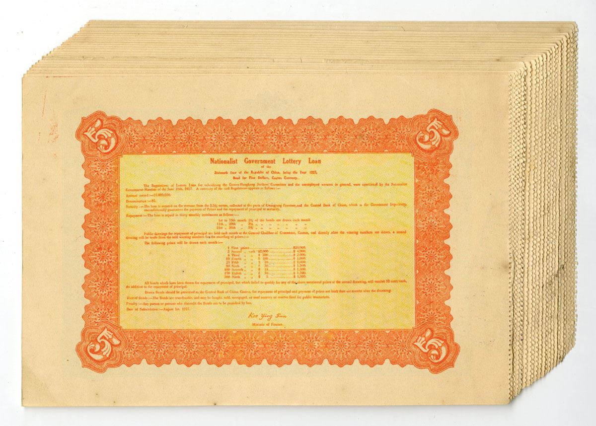 China, 1927. 5 Yuan (24), I/U Nationalist Government Lottery Loans, Green print with tan underprint, Chinese text at left and right with portrait of SYS at top center, Back is orange and yellow with English text, Condition ranges from XF to AU condition. (24). Sold "AS IS" no returns accepted.